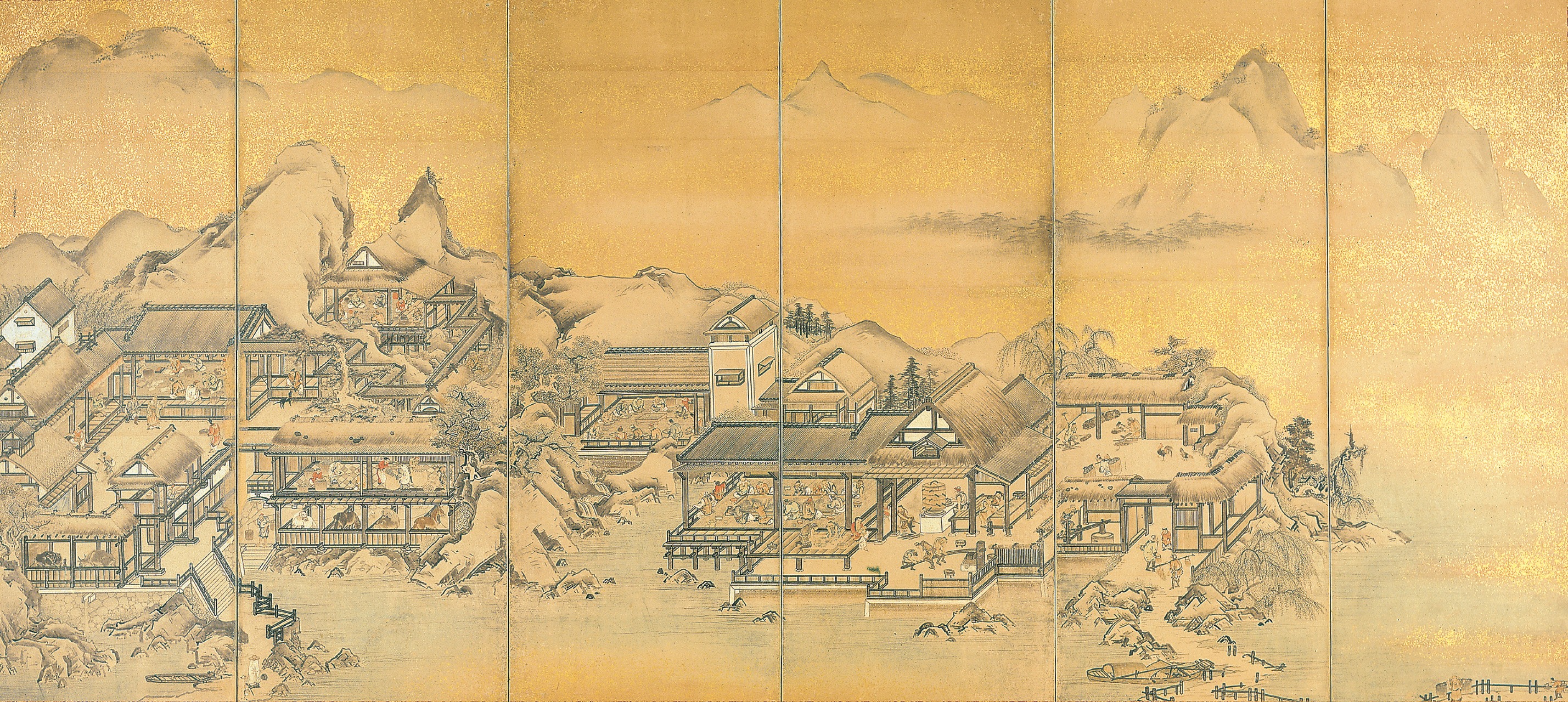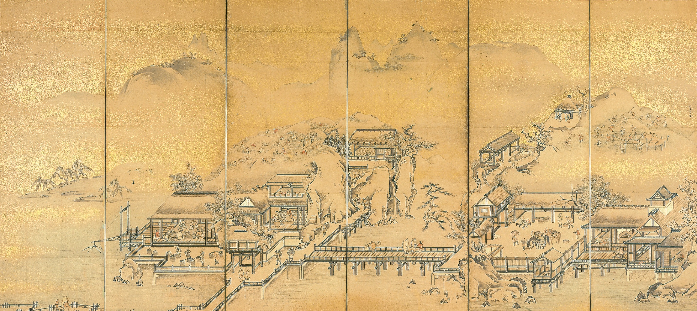 美術館カフェでのひとときをお楽しみいただいたののち、美術館所蔵品の中から、松山藩御用絵師・松本山雪の屏風を、ガラスケース越しではなく畳を敷いた空間で間近に鑑賞するイベント“屏風の居場所”を実施します。