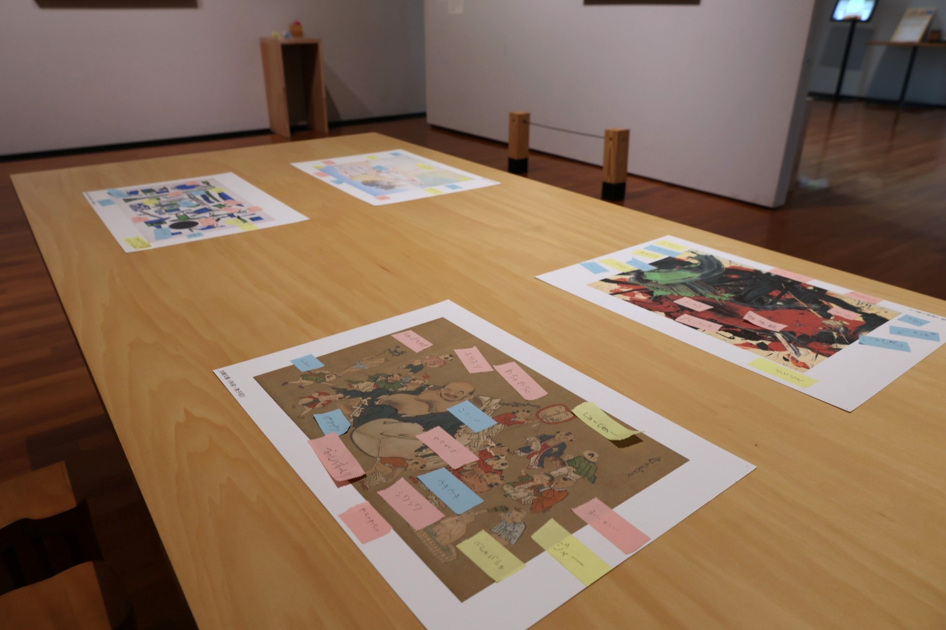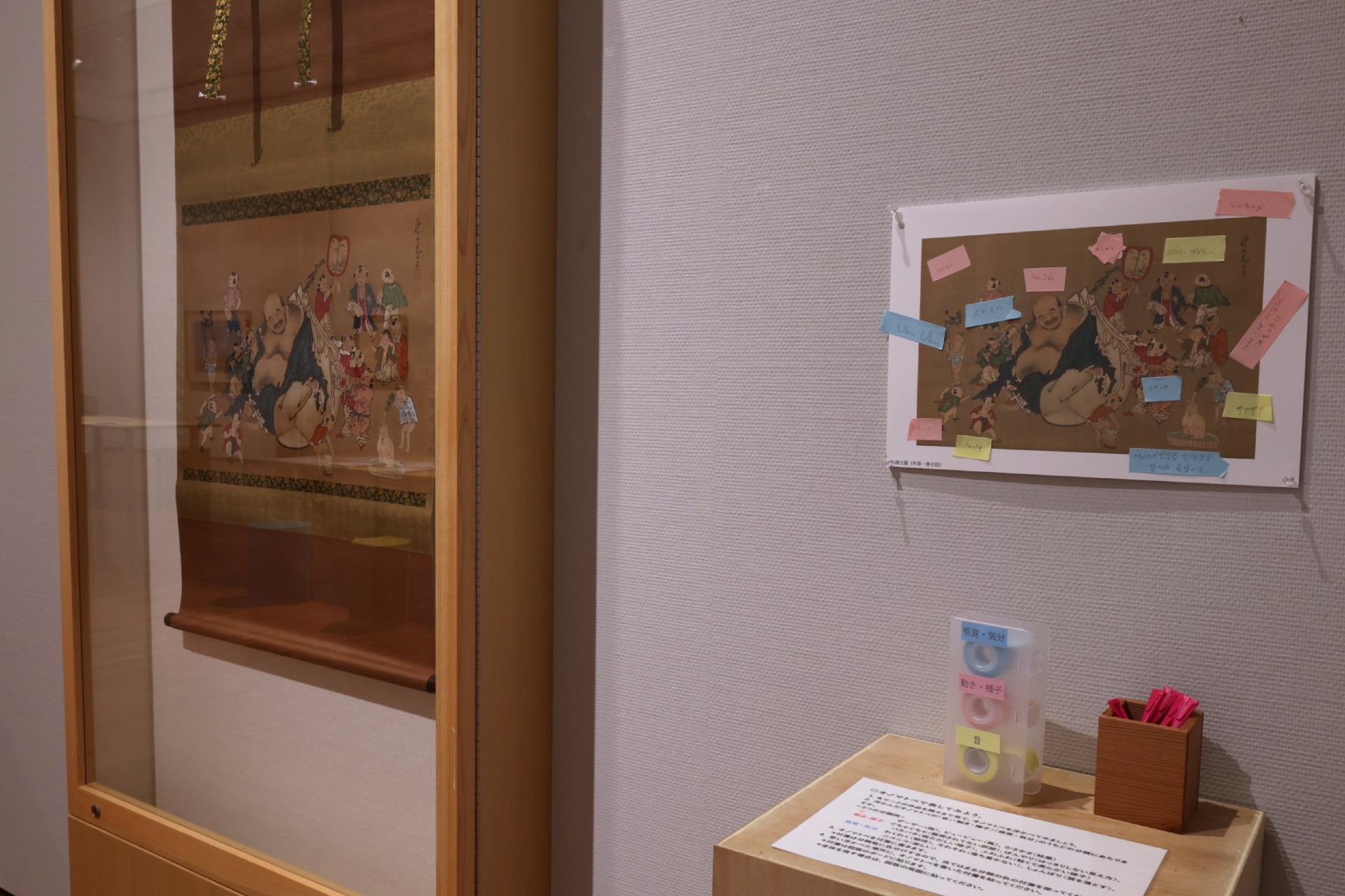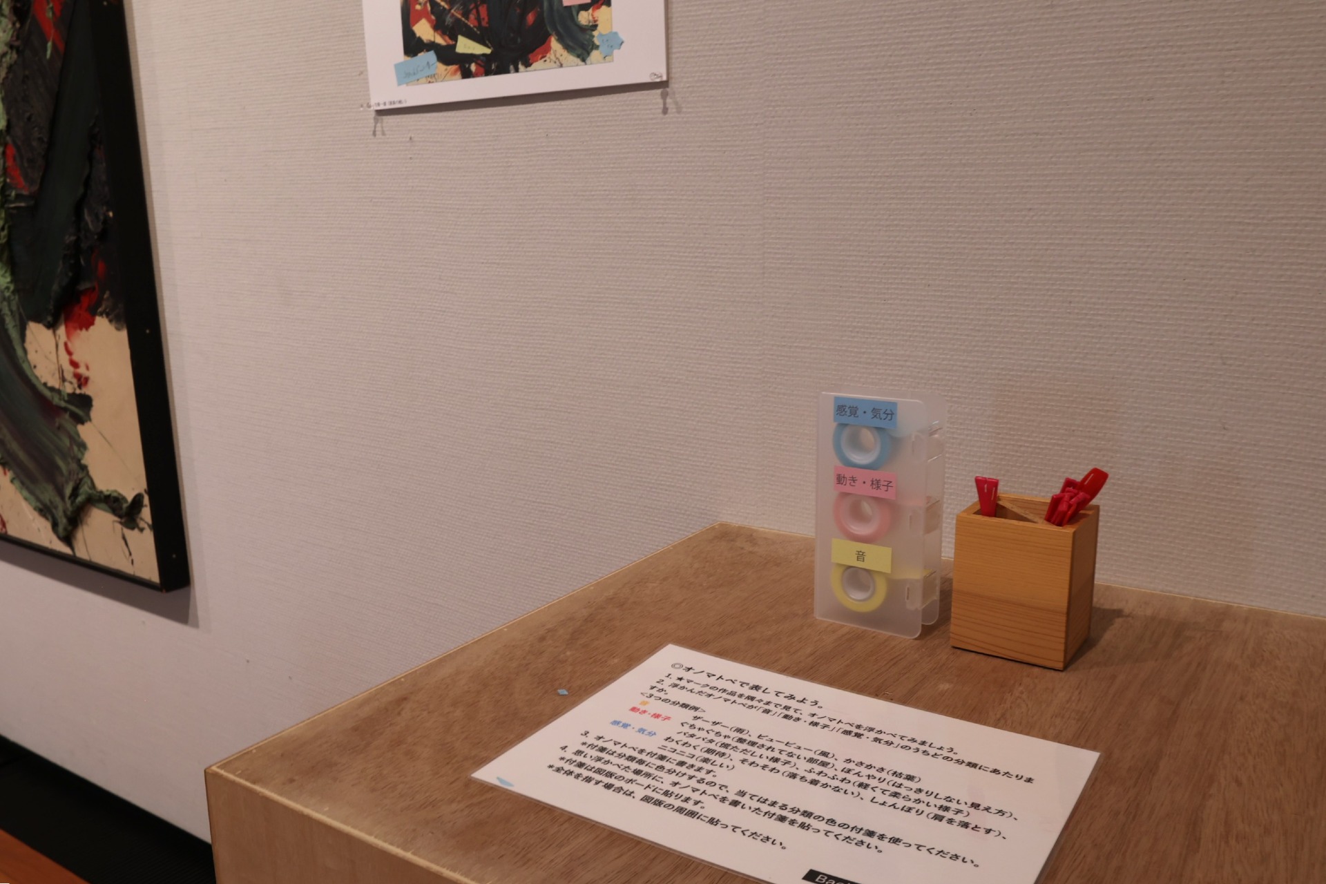 展示室内には、作品から連想したオノマトペを、紙に書いて自由に貼ることのできるボードを設置。自分の考えたオノマトペを、他の人と比べることで、作品の見え方が変わるかもしれません。